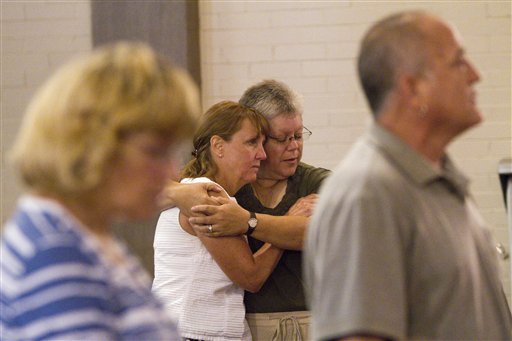 Hochhalter sat in the front row wearing a silver cross around her neck during a vigil for the victims Sunday, joining several thousand people who gathered to pray as the sun set.