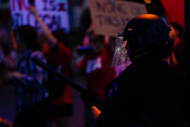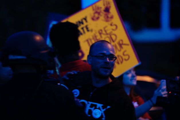 Protesters continued to circle Choates’ home, were Aurora police armed with rifles stood in driveway in a clearly defensive stance.