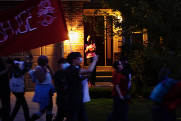 The protesters ultimately gathered in front of a home protected by armed police. The normally quiet suburban street and sidewalk was flooded with the more than 100 protesters holding flags and signs. Police vehicles and police in riot gear repeatedly steered the protesters down the block, who chanted “Abolish ICE” and made a great deal of noise banging on pots and pans and playing instruments such as trumpets.