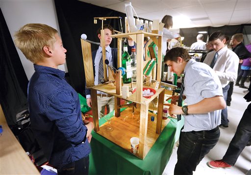 “We learned about acceleration, force and transference,” said Emma Poitras, who, with partners Ella Brown and Sierra DesPlanques, created a 14-step toaster process. Their machine included a cellphone set to vibrate that kicked off the steps by pushing a ball bearing down a tube.